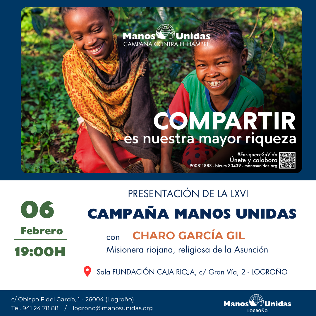 Con Charo García, misionera riojana, religiosa de la Asunción, con más de 40 años de experiencia en África (Burkina Faso, Camerún), junto con la presidenta-delegada de Manos Unidas en Logroño, Bárbara Torres, quienes nos acercarán a la riqueza de compartir con los que más lo necesitan.